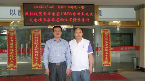 2013年9月26日上午9時許,六安索伊電器制造有限公司與安徽恒瑞新能源科技有限公司在索伊電器會議室隆重舉行了10MW分布式光伏發電項目合作簽約儀式;...