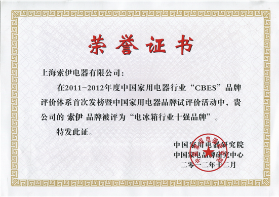2011-2012年度中國(guó)家用電器行業(yè)“CBES”品牌評(píng)價(jià)體系首次發(fā)榜暨中國(guó)家用電器品牌試評(píng)價(jià)活動(dòng)結(jié)果在北京發(fā)布,索伊冰箱從眾多參選品牌中脫穎而出,一舉奪獲“中國(guó)電冰箱行業(yè)十強(qiáng)品牌”的榮譽(yù)稱號(hào)。...
