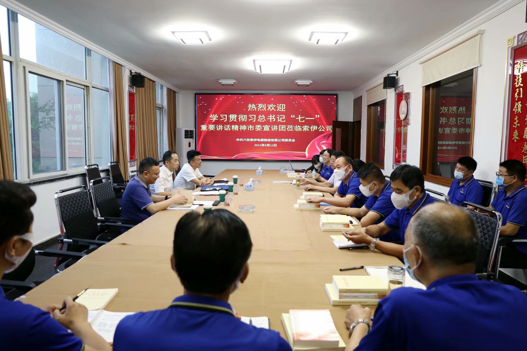 2021年8月12日上午十點,市委宣講團團長孫勇在開發區工委副書記王燊及工委管委辦公室副主任王康奇的陪同下來到六安索伊電器制造有限公司黨員活動室,對廣大黨員進行“七一”重要講話宣講,并與基層黨員進行互動交流,用講話精神凝聚人心,增進共識,推動企業健康發展。