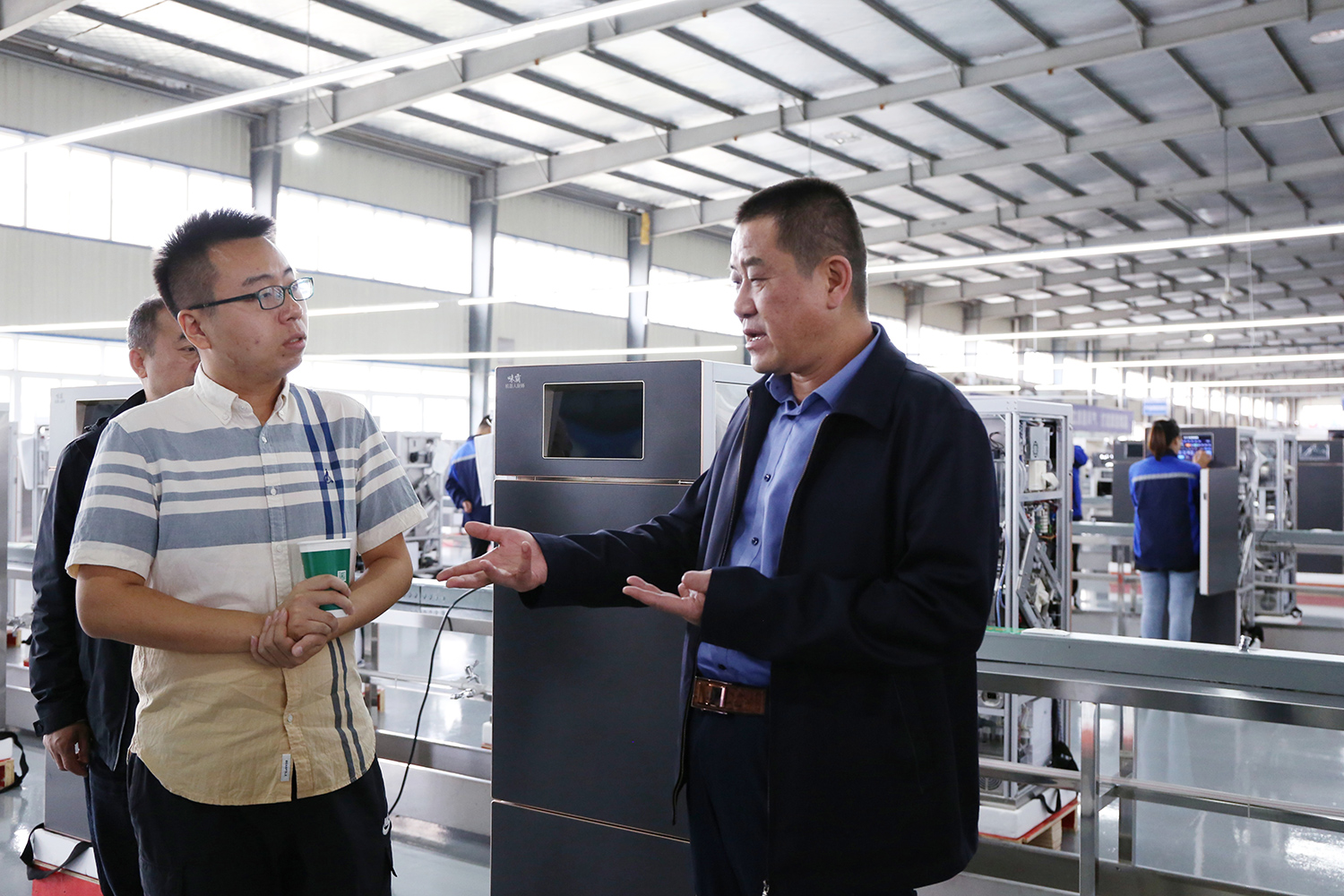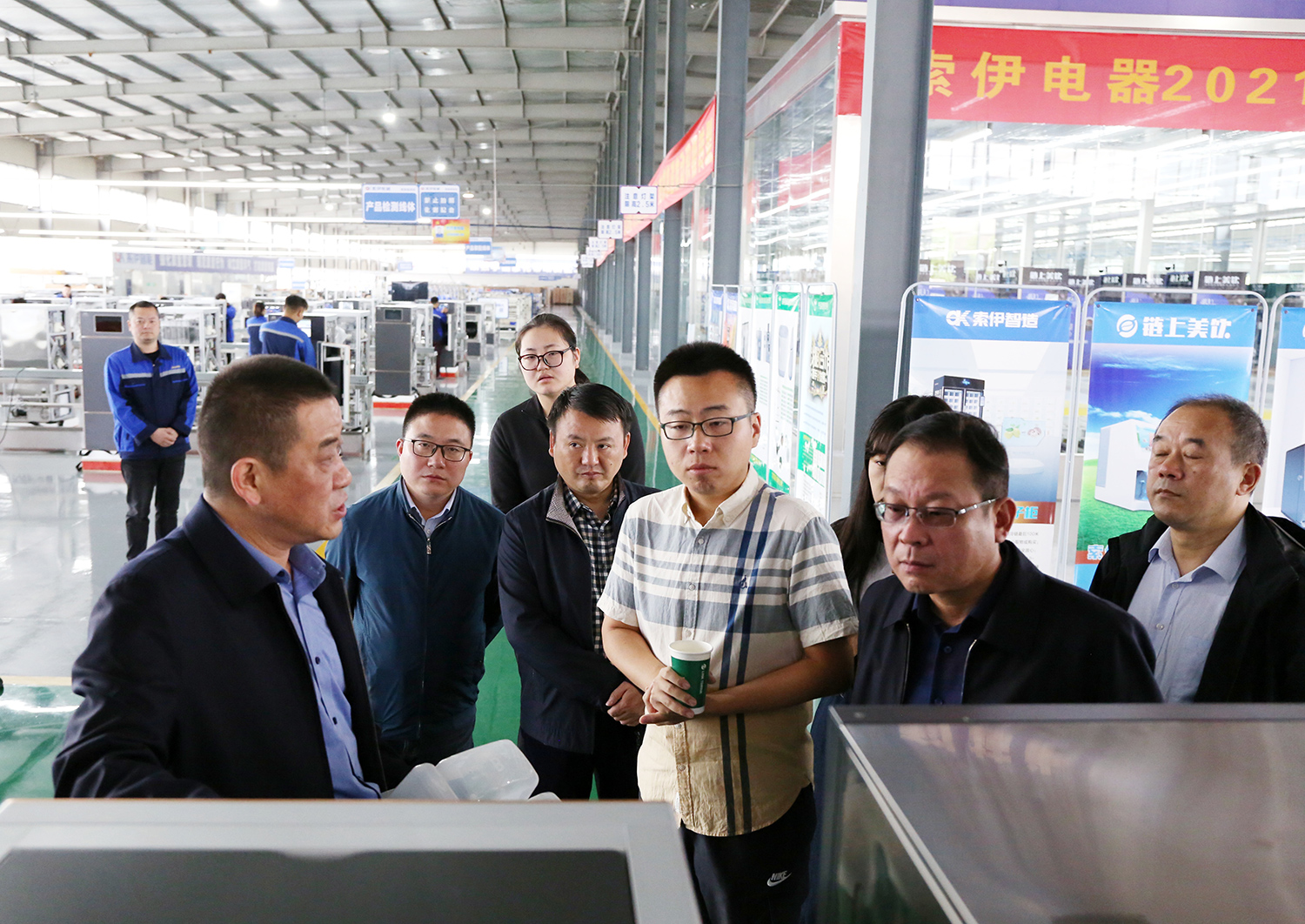座談結束后,傅雪柳一行參觀了索伊智能產品生產制造車間和升級轉型展示廳,在升級轉型展示廳里,董事長王瓊峰介紹了集團在目前電器制造企業日趨嚴峻的競爭市場浪潮中,從實際出發尋求新的突破,通過市場調研、分析后將“打造智慧餐廚項目工程,制造智能數字廚電產品”作為今后發展目標,以人工智能、大數據、物聯網為標志的餐廚項目工程,以積極的行動和朝氣蓬勃的心態迎接新一輪電器產業革命,抓住時代機遇,贏得發展先機。也讓索伊生產的智能化廚電產品走進千家萬戶,成為安徽智能化家電發展的新名片。