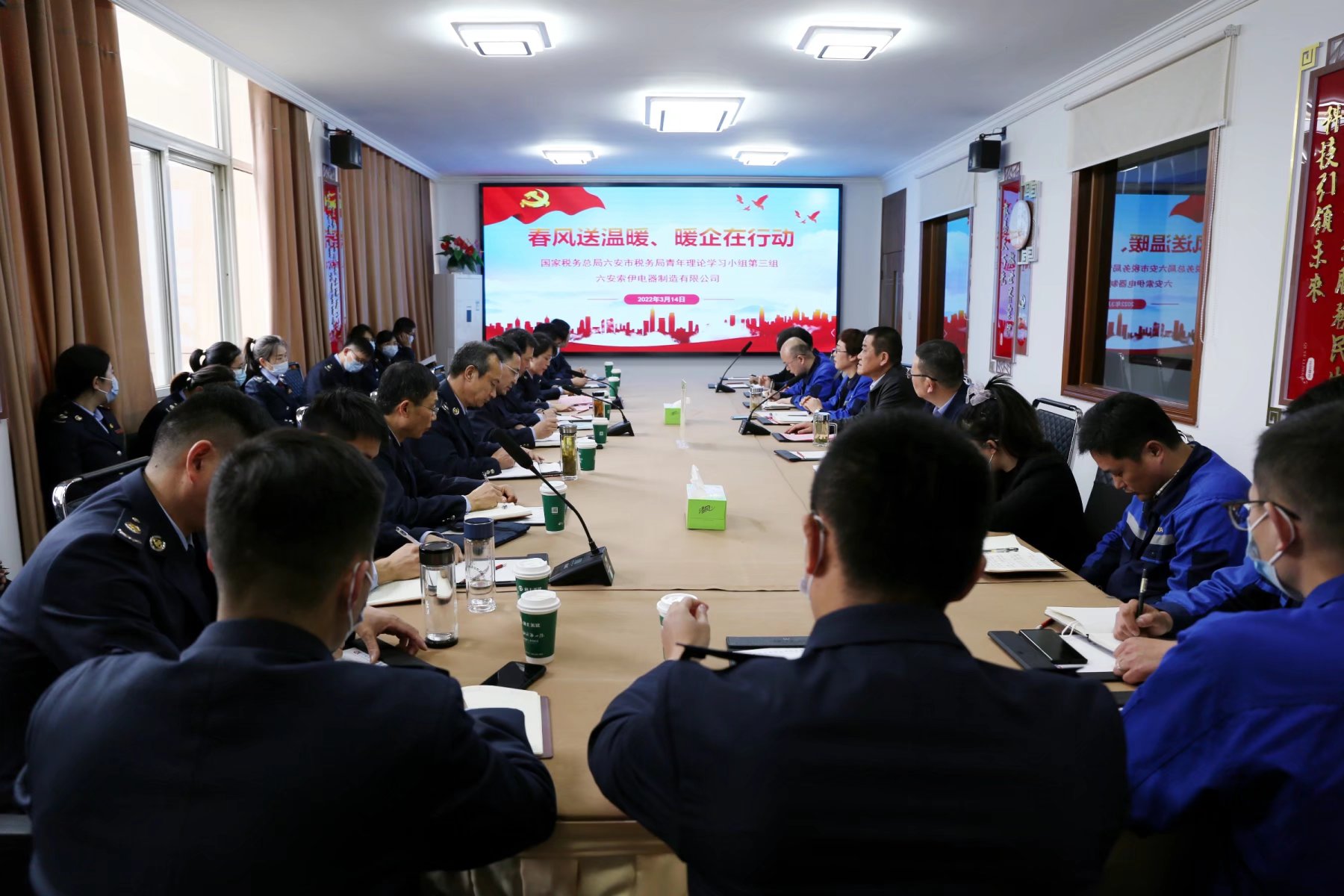 2022年3月14日下午,國家稅務總局六安市稅務局青年理論學習小組第三組“暖企行動”暨中共國家稅務總局六安市稅務第一稽查局、第二稽查局支部委員會主題黨日活動在六安索伊電器公司舉行。六安索伊電器制造有限公司董事長王瓊峰、黨委書記汪顯華及六個基層黨支部的部分青年黨員代表共同參加此項活動。